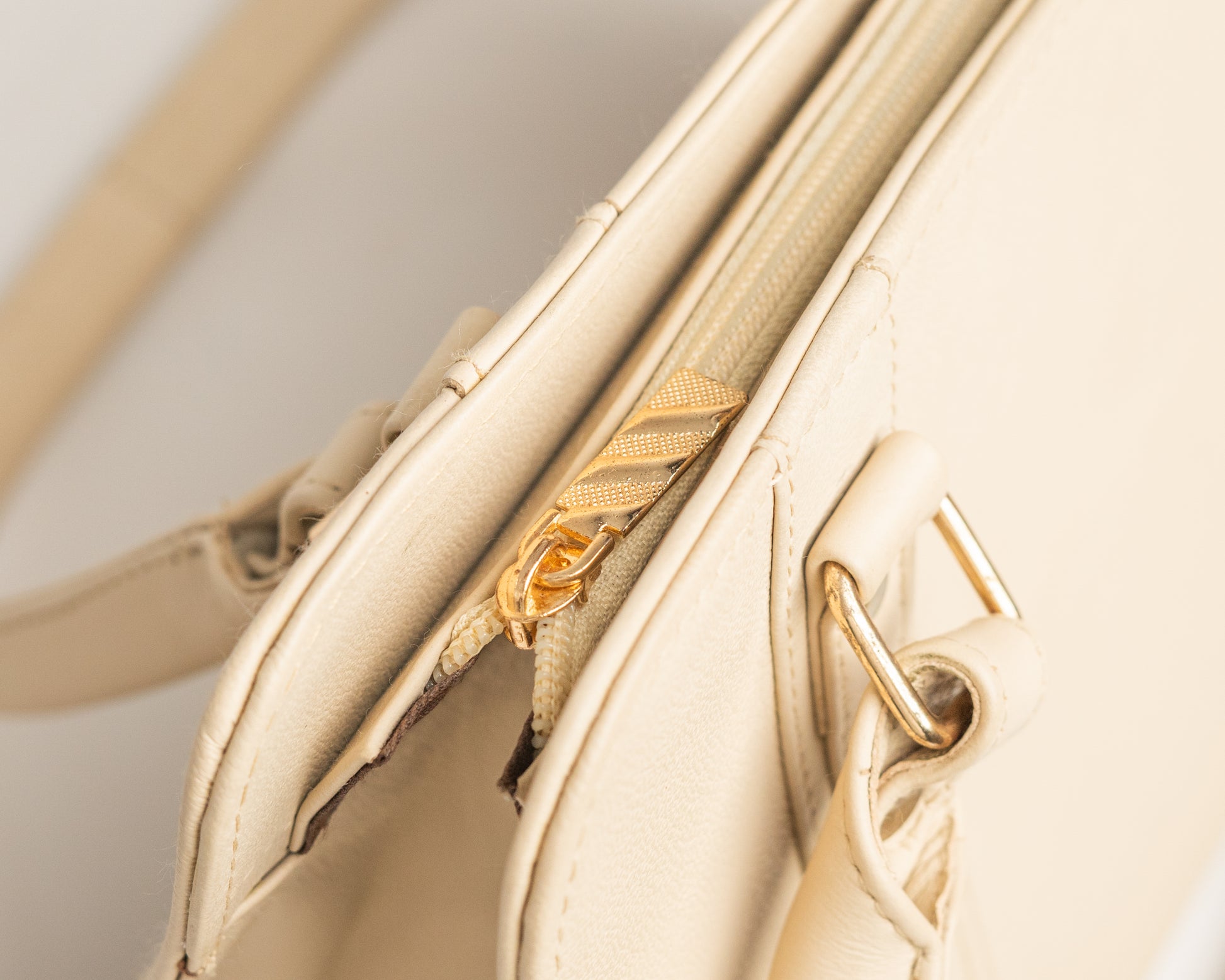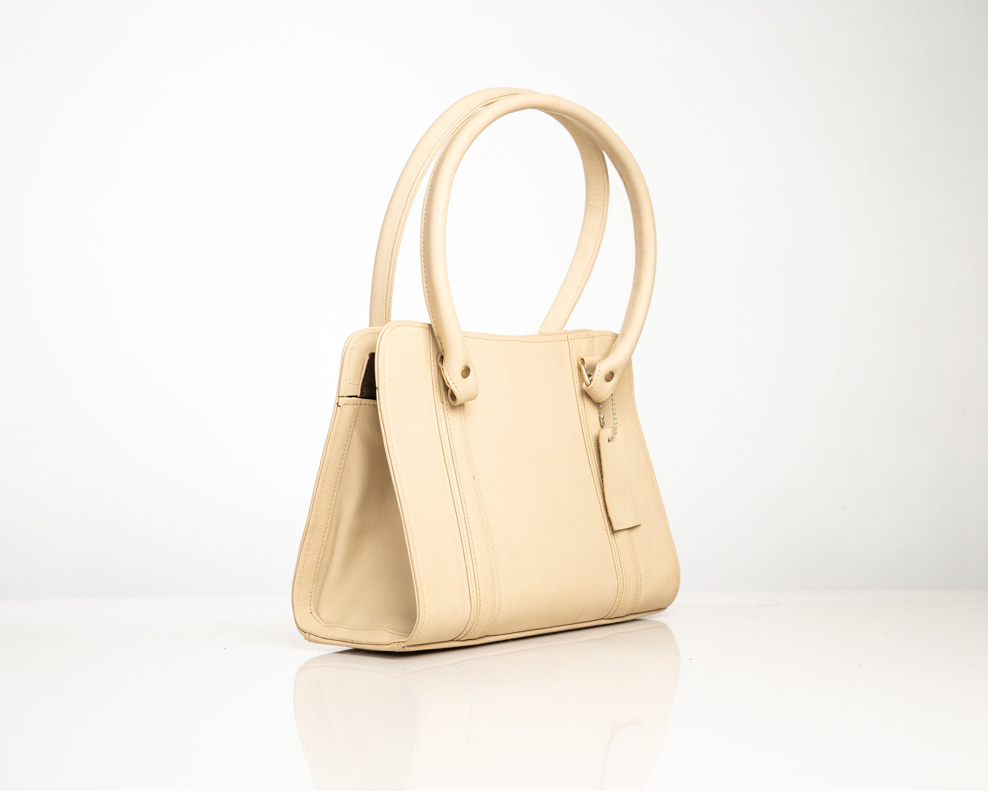 The soft beige color adds a subtle elegance that complements any outfit, while the structured silhouette ensures your essentials stay organized and secure. With a zip-top closure and spacious interior, this handbag provides practical storage without compromising on style.