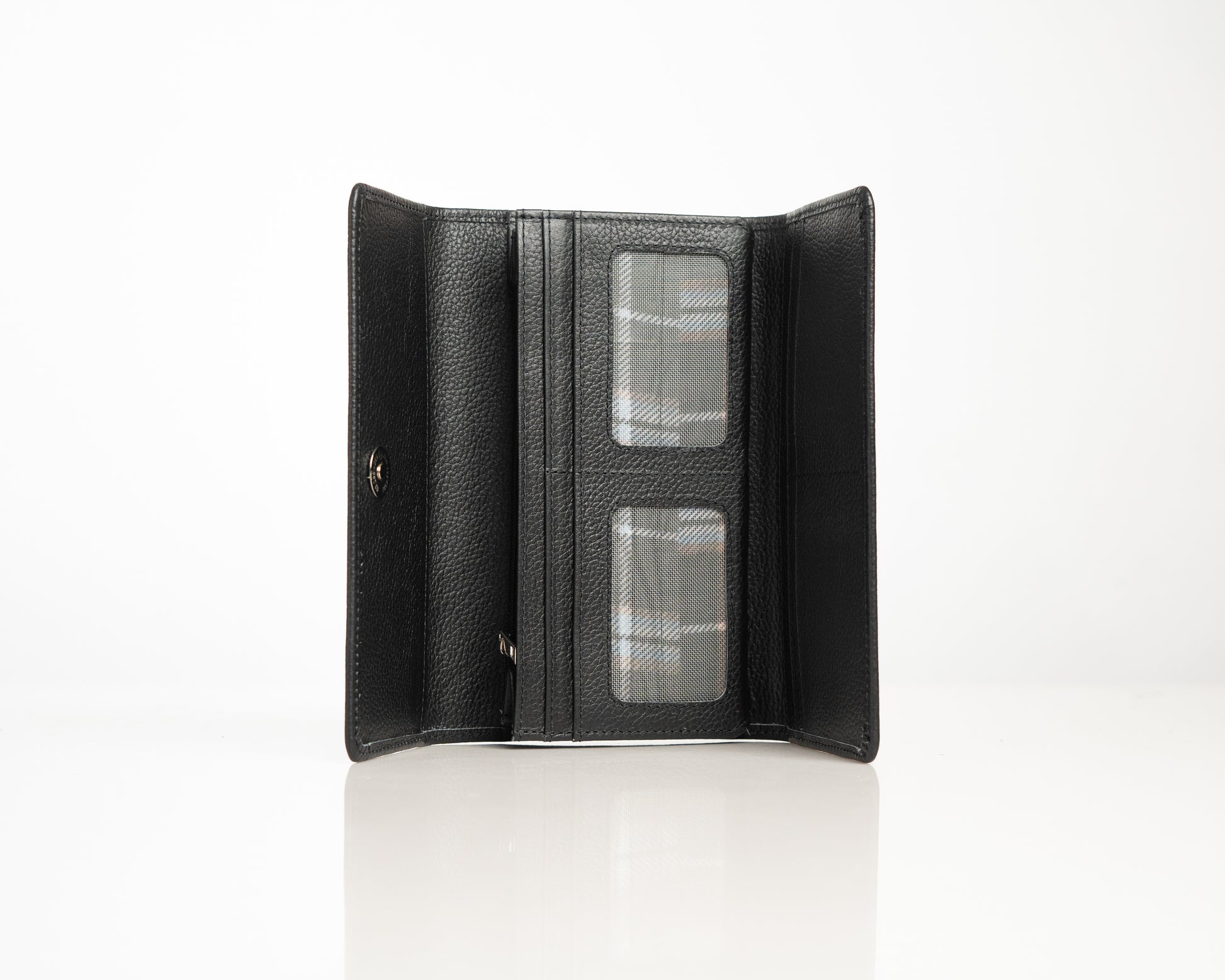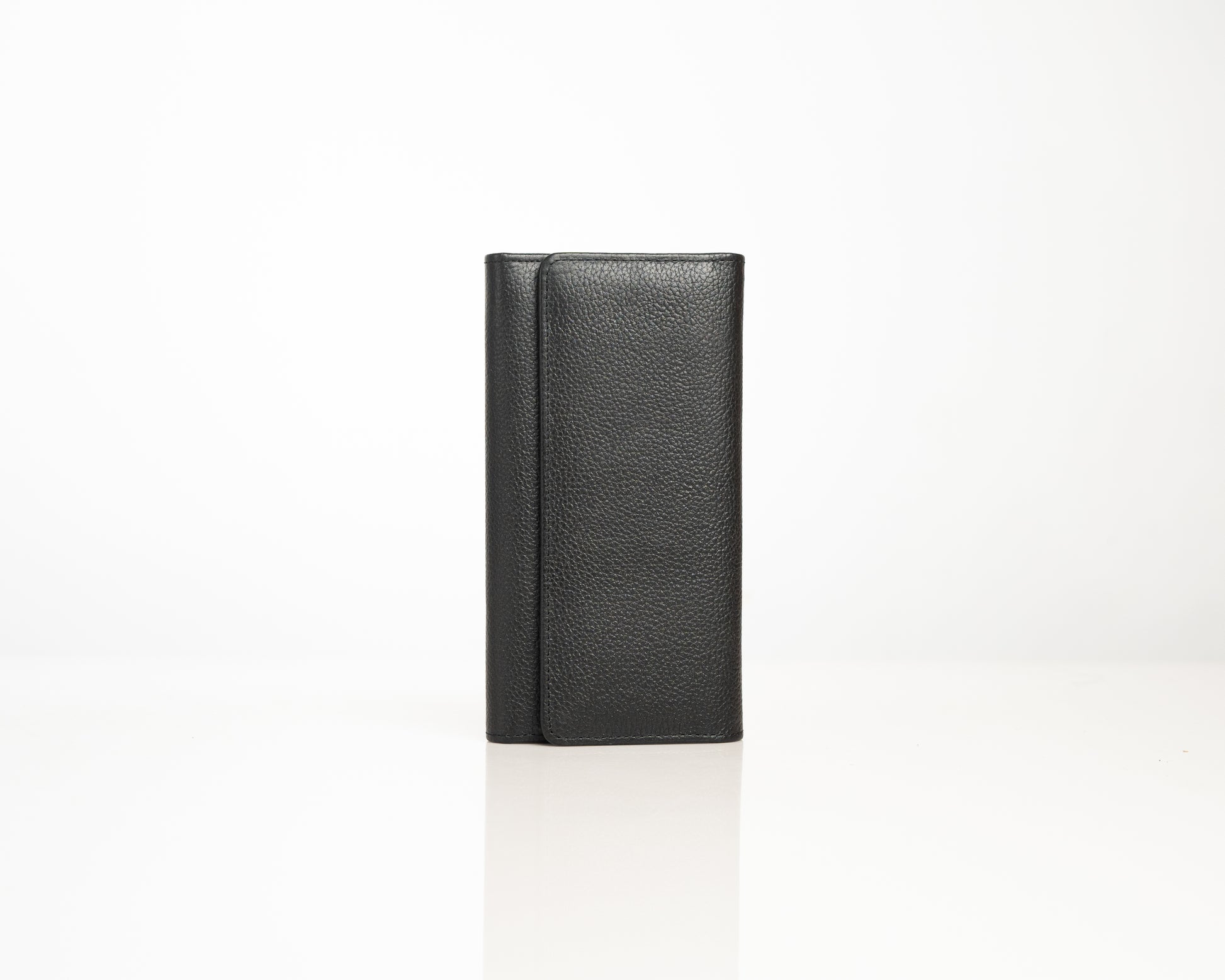 Introducing the Elegant Black Leather Wallet, where sophistication meets smart organization. Crafted from premium top-grain leather with a refined pebbled texture, this vertical trifold wallet offers both style and substance. Its structured shape and compact form make it ideal for professionals and travelers who prioritize both elegance and efficiency.