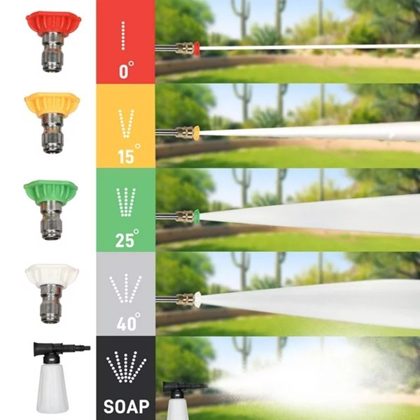 Power washer comes with 4 interchangeable nozzles (0°, 15°, 25°, 40°and soap). 0º - areas that are high and hard to reach; clean crevices in sidewalks or driveways; 15º- use on concrete, brick, and other hard surfaces with stubborn stains; 25º- use on painted surfaces, wood siding, fences, and lawn mowers;40º- use on windows and screens; soap- use to spray soaps and detergents. Freely select the high-pressure nozzle best suited to your task.