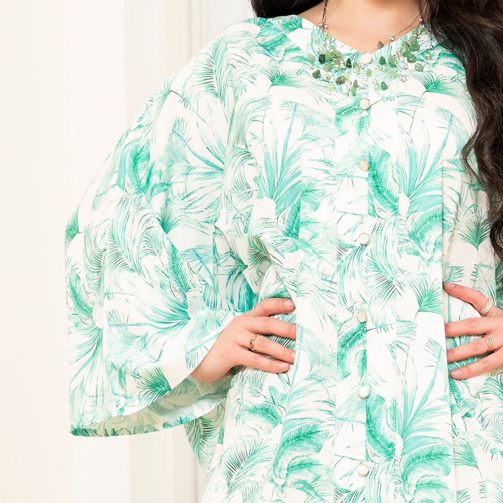 Stay breezy and stylish with this tropical-inspired vacation maxi dress. Featuring a flattering V-neckline, airy batwing sleeves, and botanical prints, it's designed for relaxed elegance. Functional buttons and side pockets add charm and convenience, perfect for seaside strolls and sunny getaways.