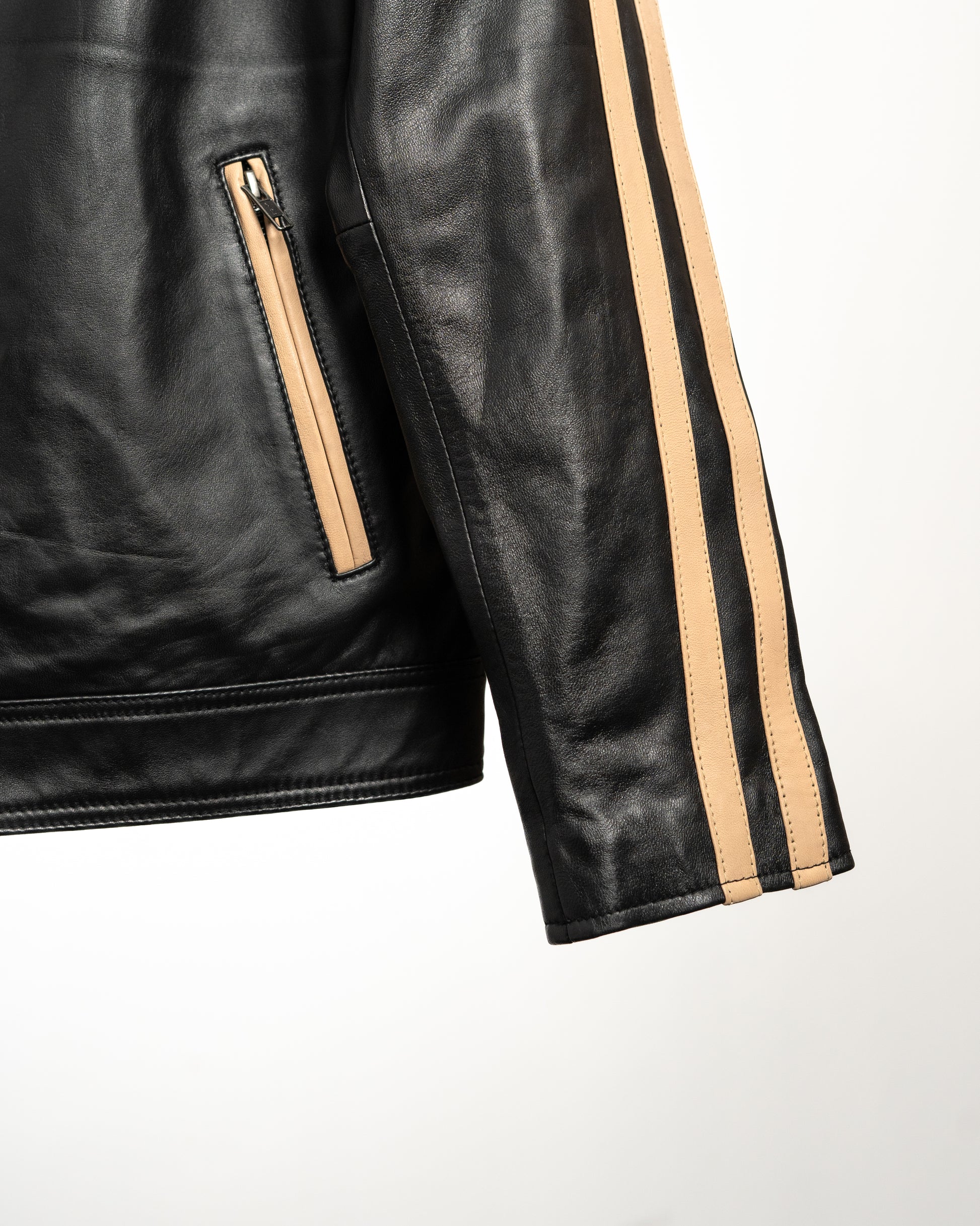 Elevate your style with this Men’s Black Leather Jacket, featuring bold beige racing stripes down the sleeves and pocket trims for a sporty, modern look. Crafted from premium genuine leather, this jacket offers a smooth, supple texture combined with durable craftsmanship.