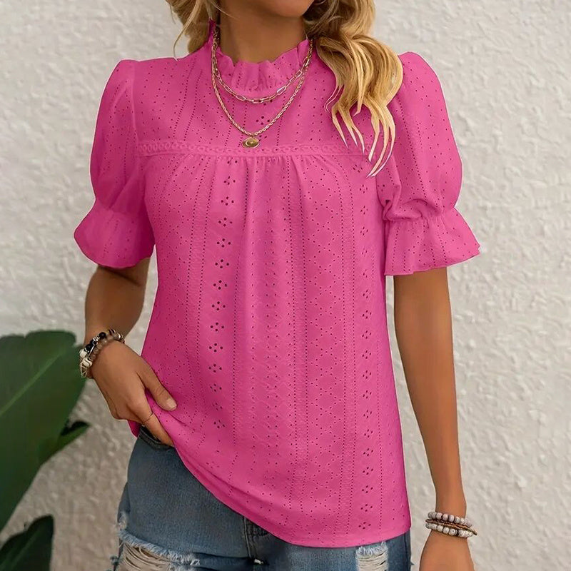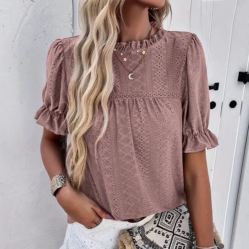 Elevate your everyday wardrobe with this Women's Elegant Ruffle Detail Blouse , combining classic charm with a modern twist. Featuring delicate ruffle accents , a flattering round neckline , and short sleeves , this blouse offers a polished look perfect for both office wear and casual outings. Made with lightweight, breathable fabric for all-day comfort, it’s the go-to top for effortless sophistication.